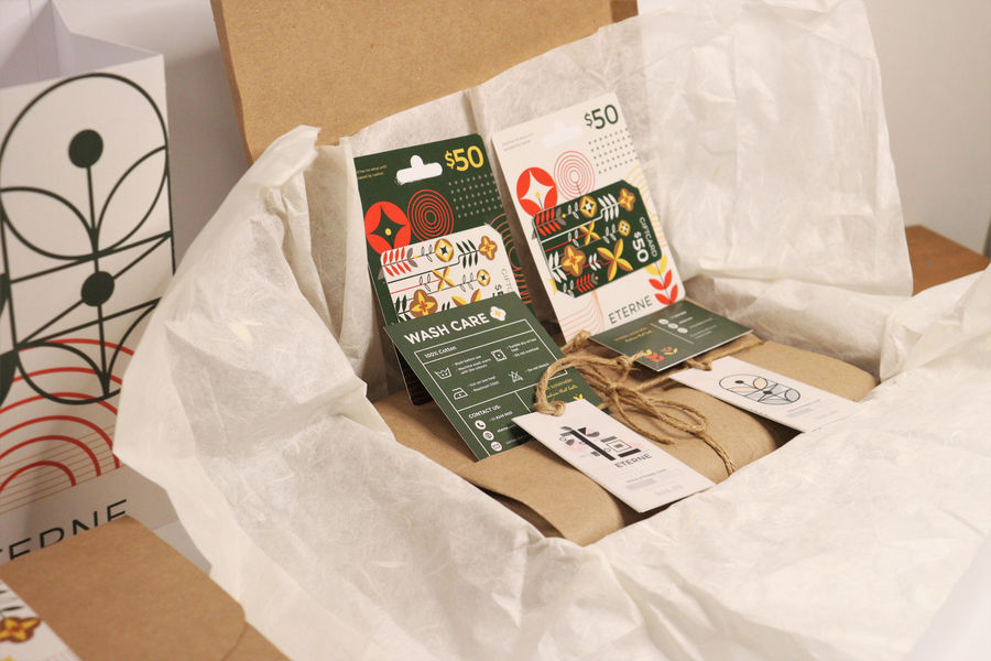 Collaterals include: 2 Hangtags, 2 Giftcards, 2 Box sleeves, 1 Washcare card, 1 Business card, 1 Shopping bag